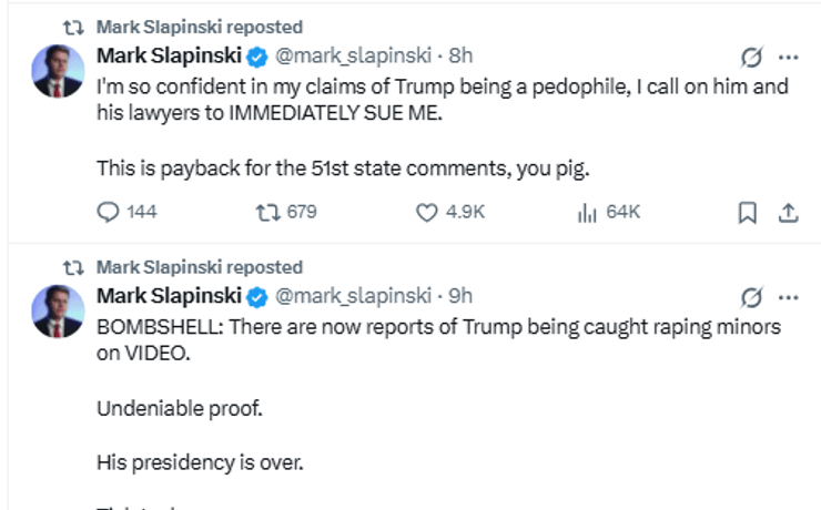 «Я настолько уверен в своих утверждениях о том, что Трамп — педофил, что призываю его и его адвокатов немедленно подать на меня в суд. Это расплата за комментарии о 51-м штате, ты свинья».
