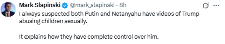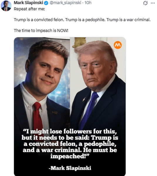 В частности, у себя в Х Слапински опубликовал призыв к импичменту Дональда Трампа.