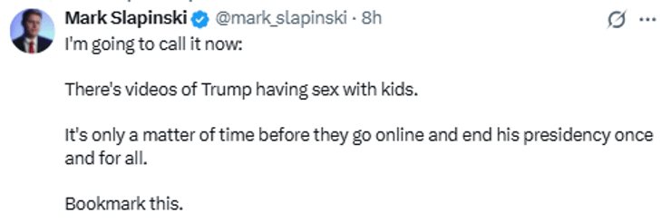 На этом Слапински не остановился и снова написал, что якобы существуют видеозаписи, где президент США делает с детьми далеко не детские вещи.